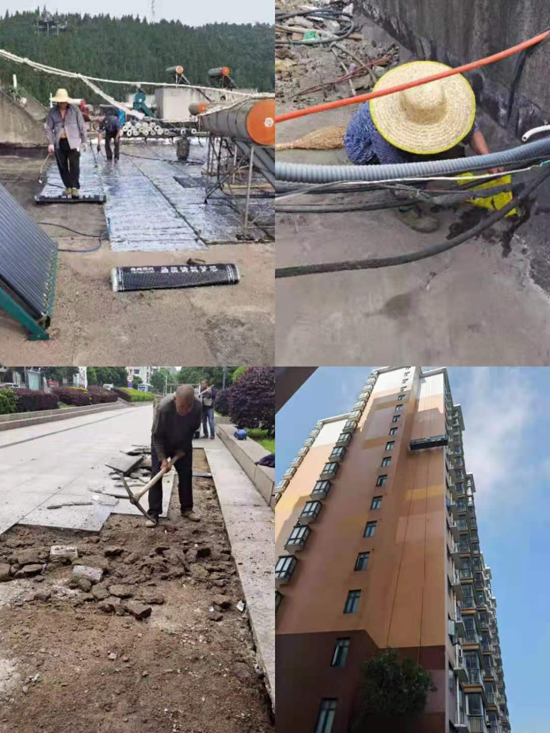 (圖為維修人員在維修屋面、外墻滲水;小廣場路面)